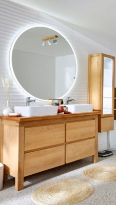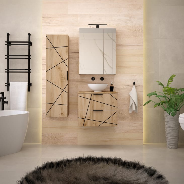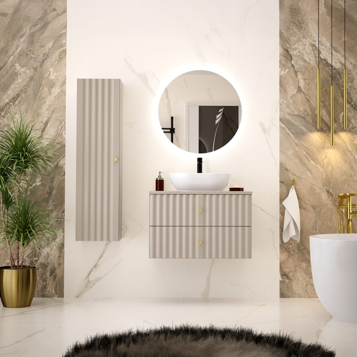 Ce meuble de salle de bain Adriel est vraiment pratique ! Dimensions 60cm de large, en stratifié cachemire beige avec 2 tiroirs à fermeture silencieuse. Vasque en céramique 41x41cm incluse, plan de toilette non percé. Poignées PVC noires, or et argent incluses au choix. 70% du bois est certifié FSC. Meuble à suspendre - vis et chevilles non fournies. Pensez à bien aérer et sceller les joints avec du silicone. Livré en 3 colis (meuble, vasque, plan). Fabrication européenne de qualité, garantie 24 mois. La solution rangement idéale pour une salle de bain fonctionnelle et élégante !